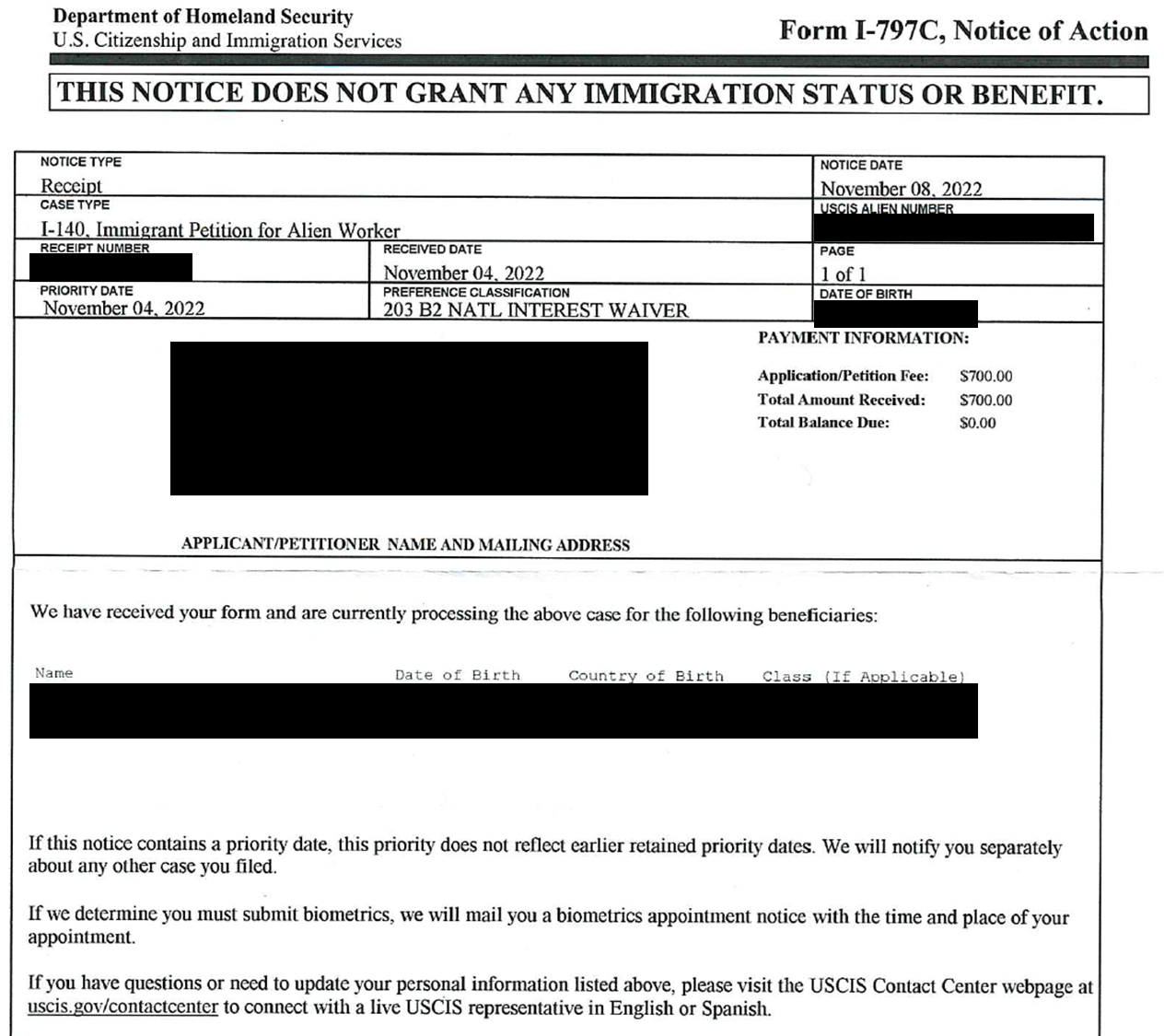 약 2주간 final review를 변호사님께서 자체적으로 진행하신 후 I-140 제출하였다.