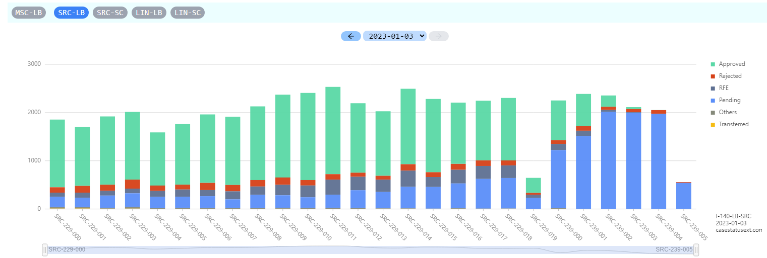SRC-LB, 즉 Texas lockbox로 접수된 I-140 서류 통계인데, 초록색이 승인된 건수다.